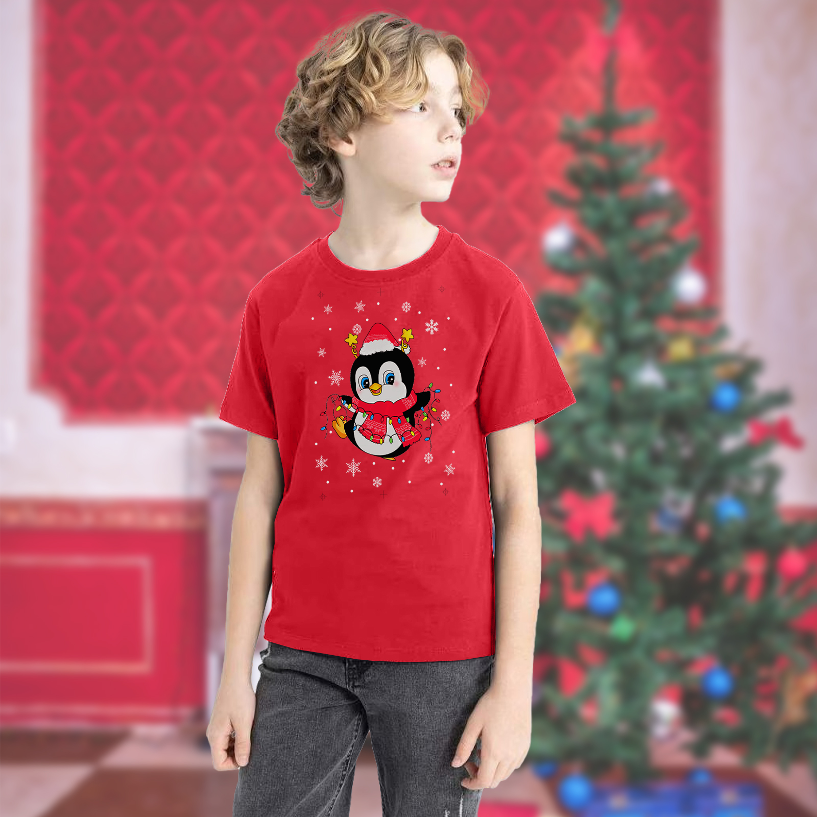 Bring festive cheer to your child’s wardrobe with the Kids Short Sleeve Crew Neck Red Penguin With Lights Print T-Shirt!