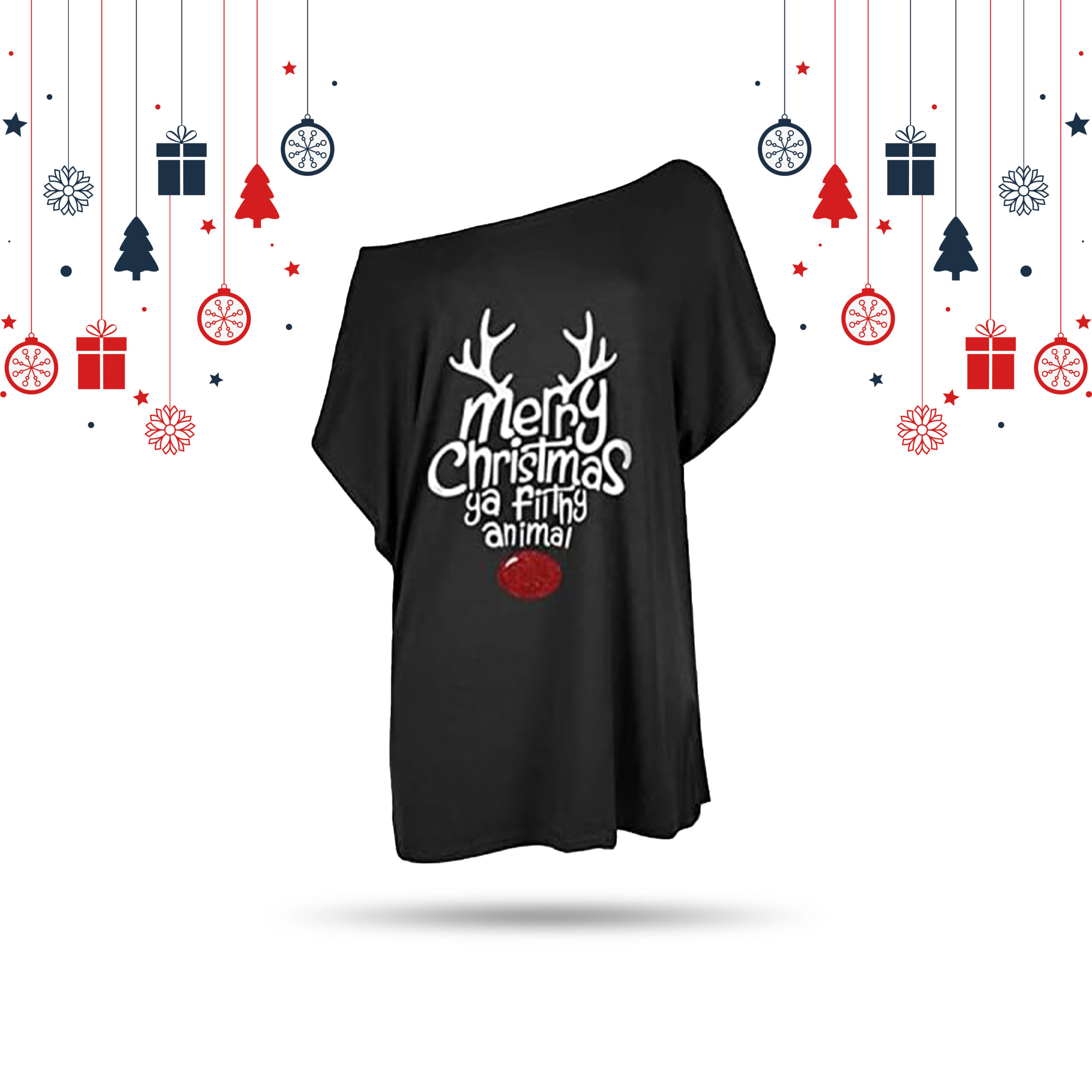 The striking Filthy Animal graphic adds an edgy flair to your Christmas wardrobe, while the curved hem design provides a modern, flattering fit. Pair it with jeans, leggings, or skirts for a trendy, festive look.