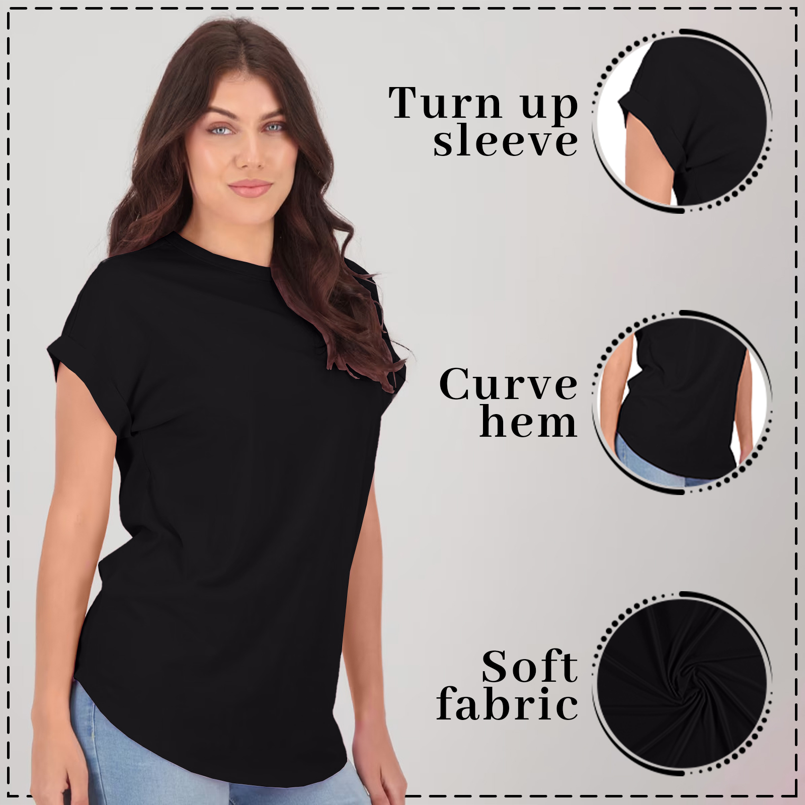 Simple, comfy & stylish — Women’s Plain Turn-Up Sleeve Round Neck T-Shirt is perfect for summer and everyday casual wear!
